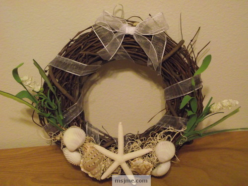 My first official Ms.Jme craft with shells turned out beautiful. I wrapped a sheer ribbon around the grapevine wreath and hot-glued shells and artificial flowers to it. I love the ocean theme. This was made as a gift for family. It looks fantastic in her bathroom!