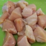 - Cut up the chicken into pieces that are large enough to skewer, but not too big. Depending on the size of the chicken breast, I get 8-10 pieces.